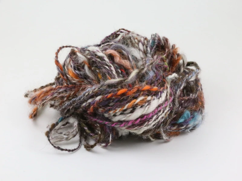 Här samsas tunt och tjockt, fluffigt och någon enstaka lock som sticker fram. Innehåller främst en blandning av lokal västerbottnisk ull, både färgad och i naturfärger, men även inslag av merino, guldglitter och silke.