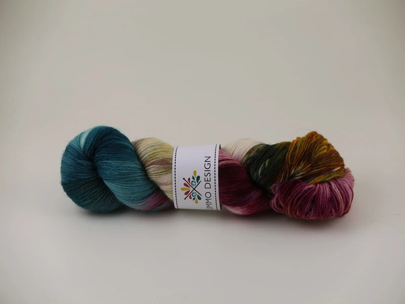 Tunt handfärgat sockgarn. En härva innehåller 100g, ca 420m. 75% ull 25% polyamid ger ett lättstickat och slitstarkt garn som är mycket drygt. Stickor 2,5-3mm