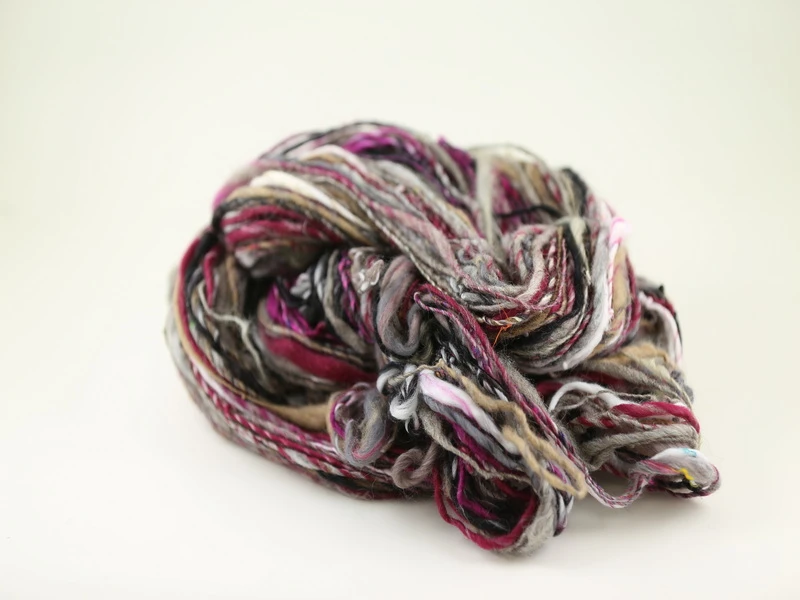 99g handspunnet entrådigt garn med mycket färger, struktur och glans. Innehåller bland annat västerbottnisk blandrasull, klövsjöull, merino, silke, angelina och mohair.